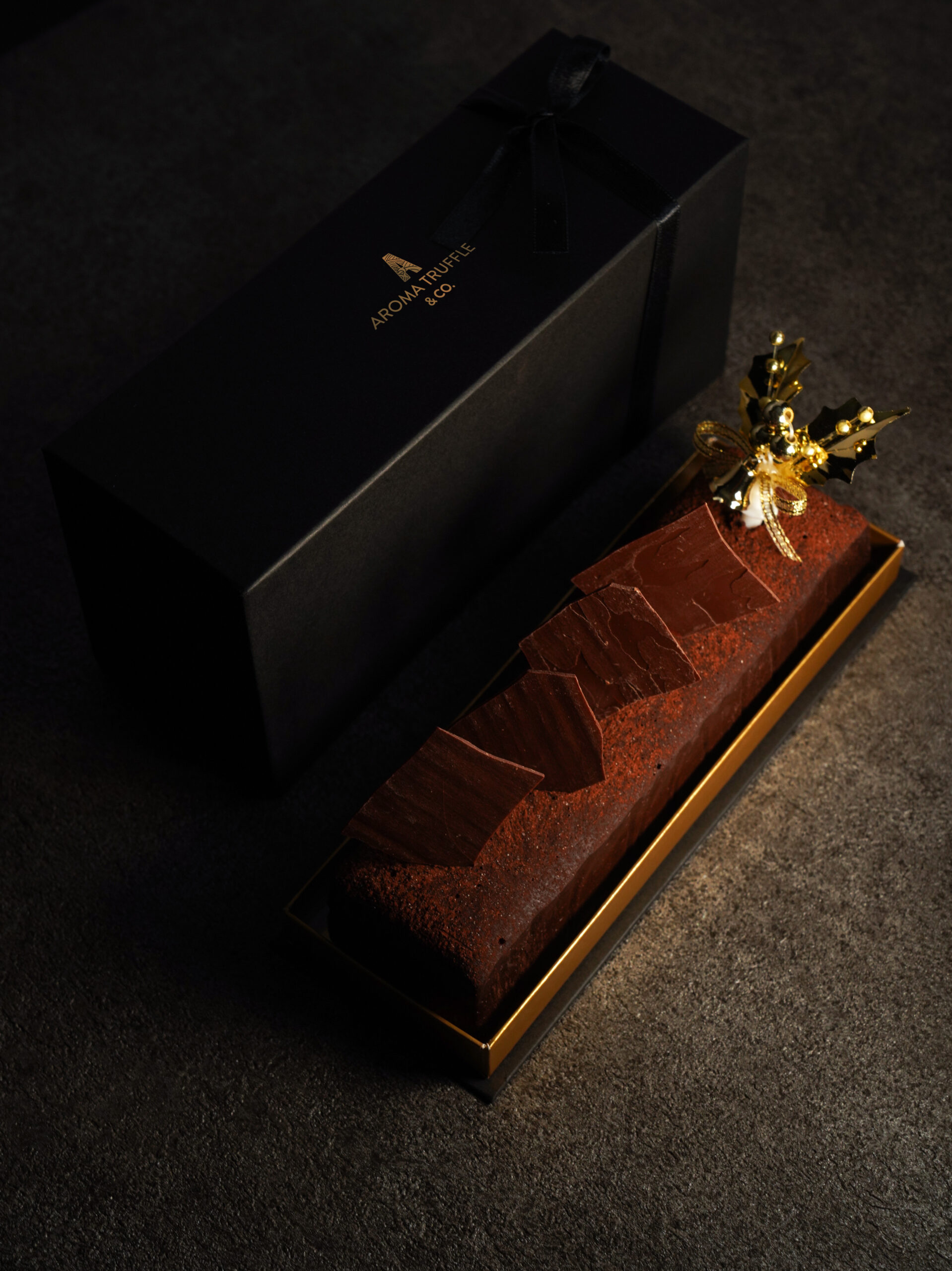 なめらかにとろけるショコラ生地に、香り高い白トリュフを使用しました。ひと口ごとに広がる深い余韻は、赤ワインやシャンパンとの相性も抜群。特別な夜を彩る、大人のための至福のノエルショコラです。